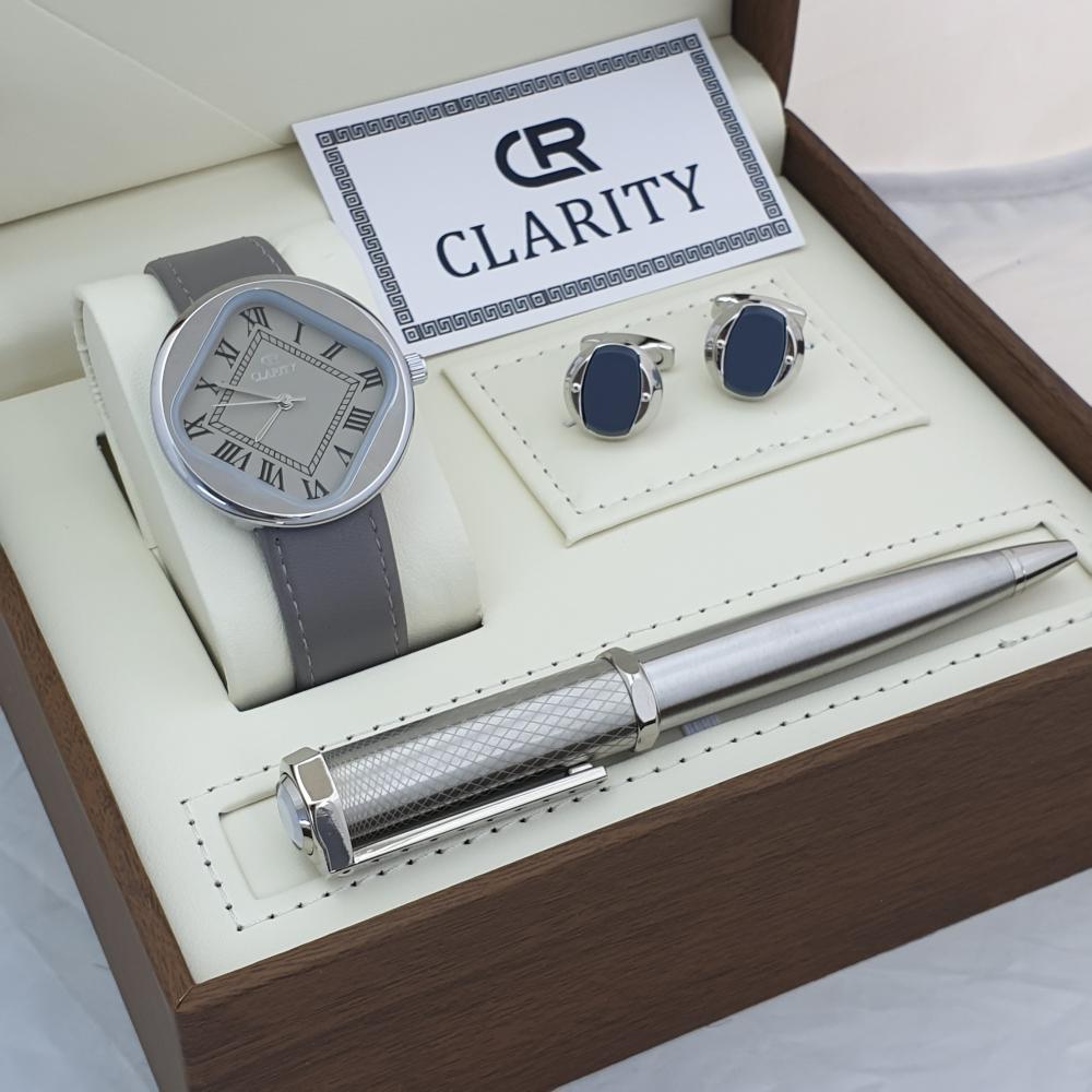 طقم رجالي ماركة كليرتي انيق يتكون الطقم من ساعه رجالية بتصميم الكارتير سير من الجلد وكذالك قلم وكبك وعلبة طقم فاخرة