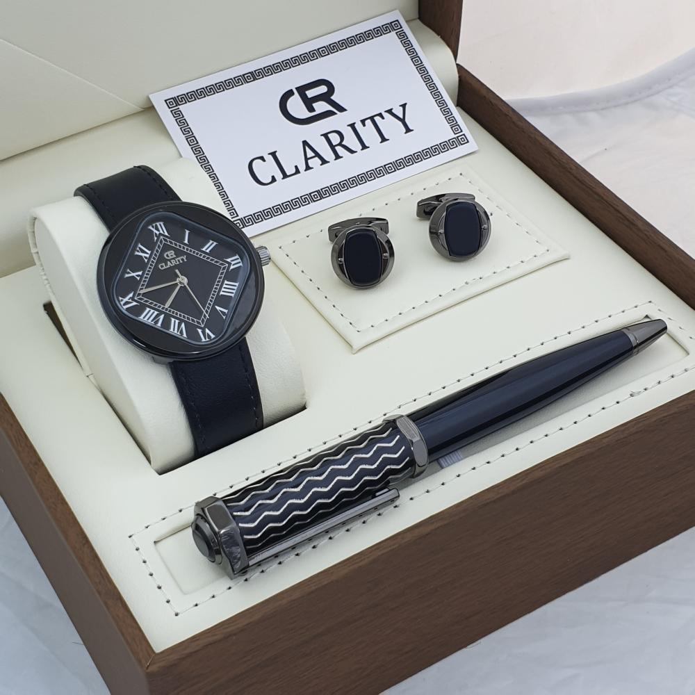طقم رجالي ماركة كليرتي انيق يتكون الطقم من ساعه رجالية بتصميم الكارتير سير من الجلد وكذالك قلم وكبك وعلبة طقم فاخرة