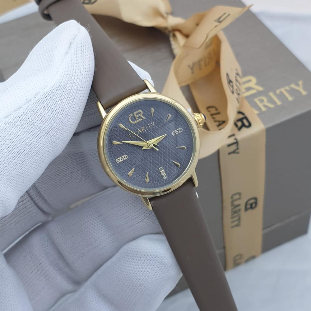 ساعة مميزة بميناء رمادي وإطار ذهبي