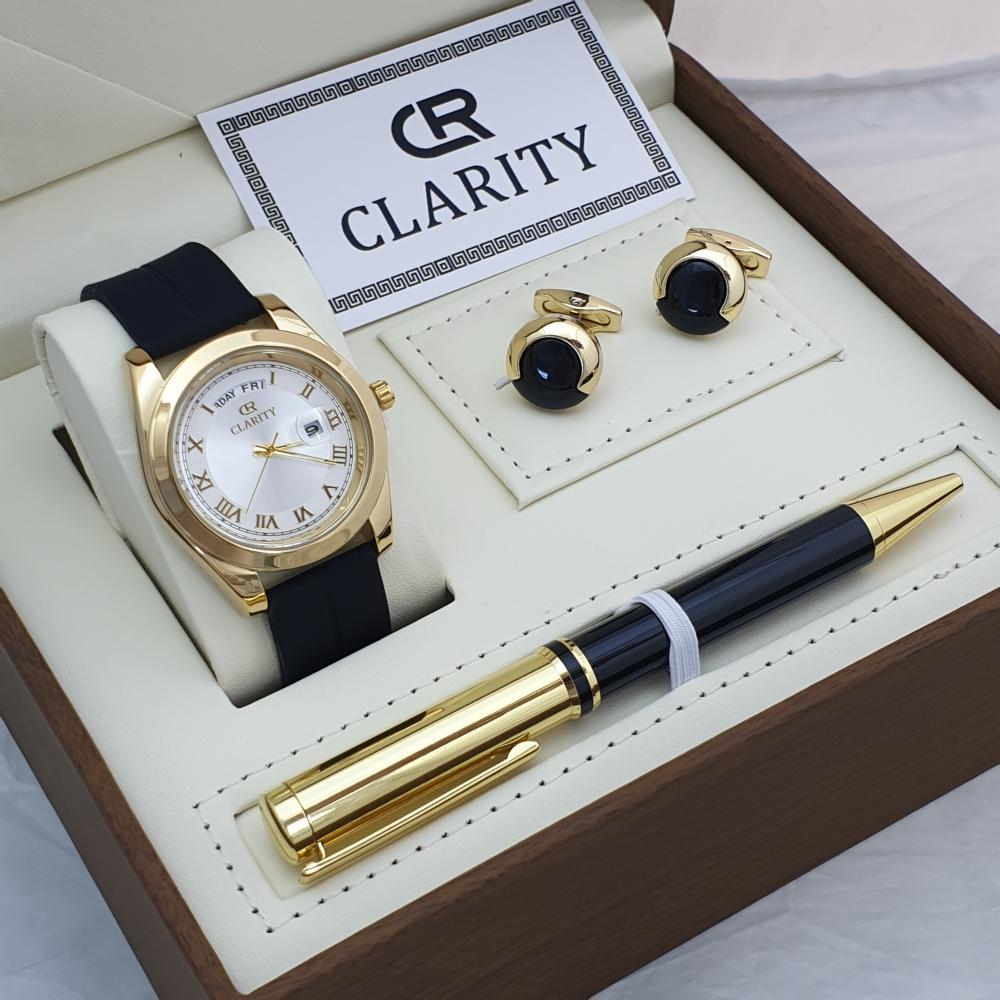طقم هدية رجالي من ماركة كليرتي هدية مغلفة بكل أناقة وجمال يتكون الطقم من ساعة رجاليه و كبك رجالي وقلم رجالي فاخر ، الساعة الرجاليه بسير ربل غفل مغناطيس هدية رجاليه راقيه ترضي جميع الأذواق